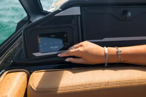 Our redesigned captain’s touchscreen now offers simplified controls, making it easier than ever to deploy the power folding Bimini or adjust the drop step. This intuitive interface puts command at your fingertips, allowing you to focus on the thrill of the water. Meanwhile, the new passenger touchscreen provides access to adjust music, seat temperature, and more, ensuring that everyone on board has control over their comfort and enjoyment.